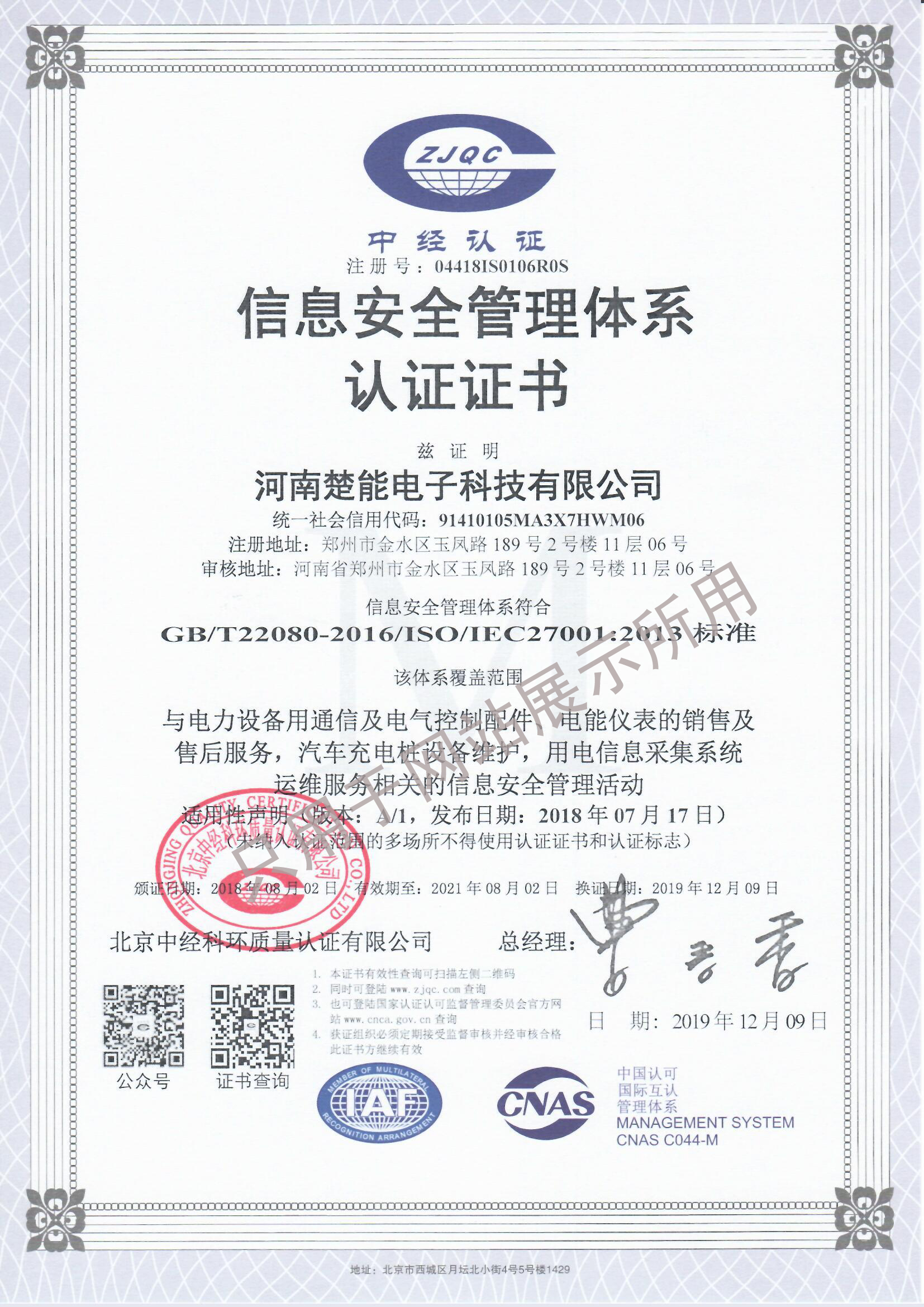 信息安全管理体系认证证书